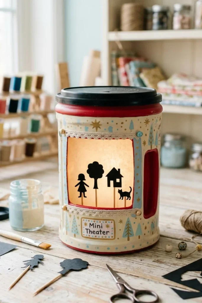 Turn a Folgers can into a tiny shadow puppet theater. Cut a small rectangular opening on one side, place a small tea light or phone flashlight behind it, and use your hand or cardboard cutouts in front to cast simple shadows. Add a small backdrop or curtain to it. This playful project entertains kids, teaches basic shadow‑play, and turns your coffee can into a mini performance stage for rainy‑day fun.