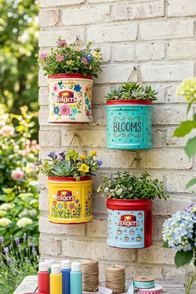 Create cozy Folgers coffee container candle holders that add warmth to any room. Paint the cans, wrap them in twine, or cover them with lace, then place a tea light or small LED candle inside. Use them on the dining table, coffee table, or by the bathtub for a soft glow. These simple holders look far more expensive than they are and turn an empty can into a charming piece of decor.