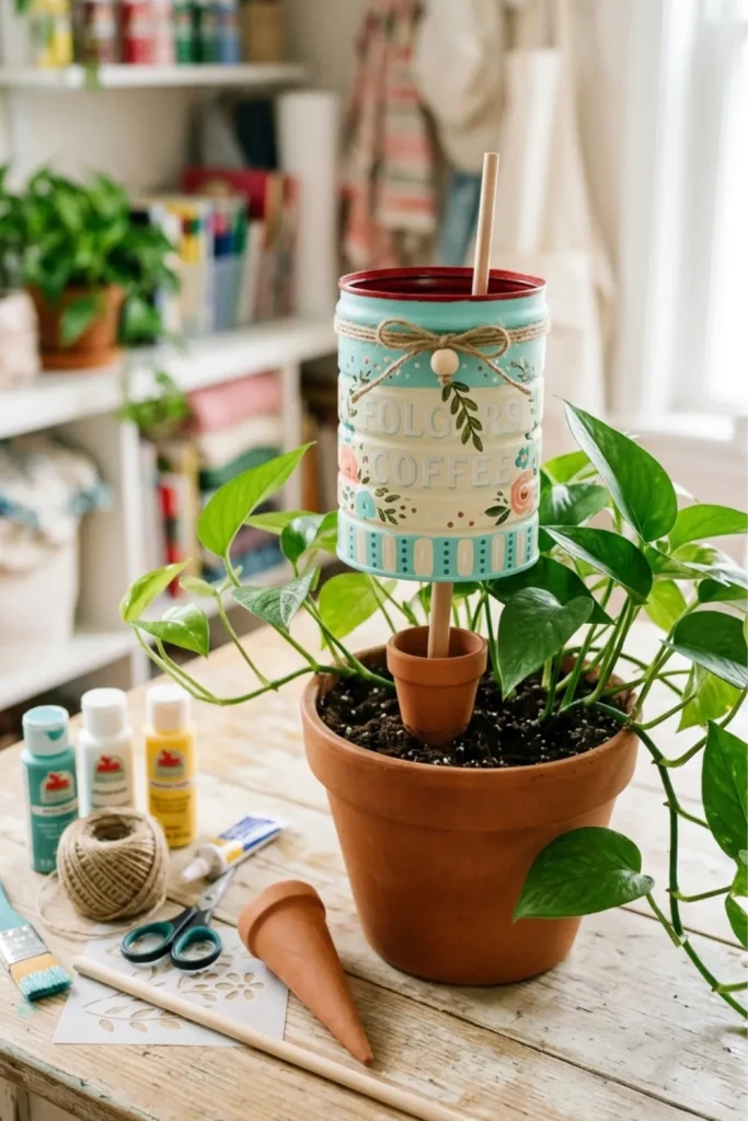 Make a simple Folgers coffee can plant watering spike for busy days. Cut the bottom of the can into a small cone shape, fill it with water, and push the pointed end into your plant’s soil. The water slowly drips into the soil, giving your plants a steady drink even when you forget. This clever hack is perfect for busy homes or anyone who wants their plants to look healthy without a full‑time gardening job.