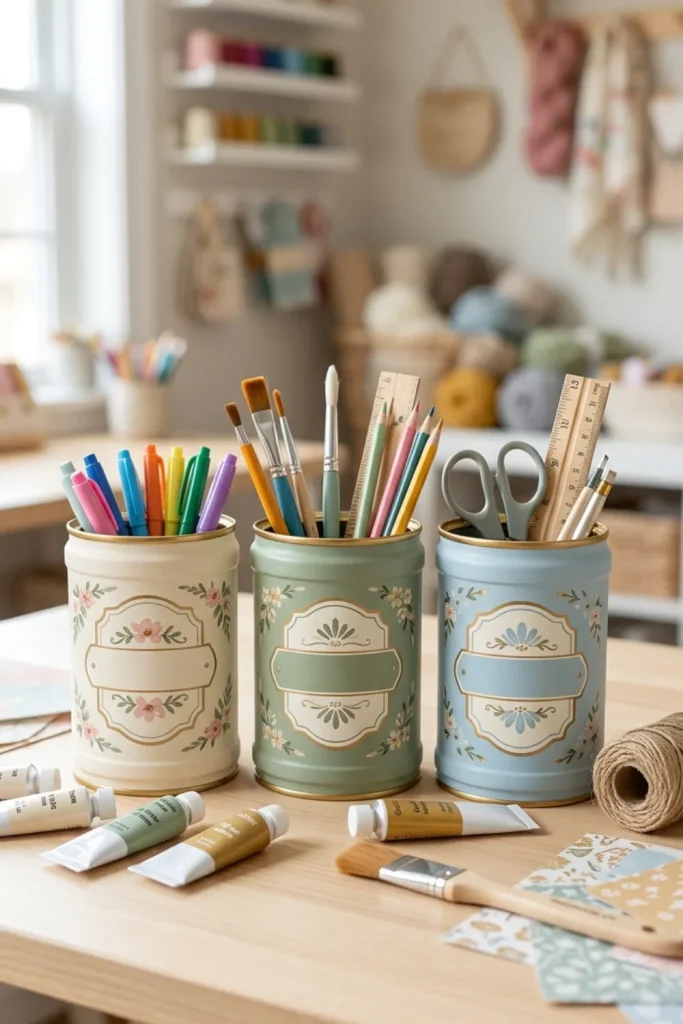 If your desk looks like a supply tornado hit it, this idea is for you. Use clean Folgers coffee containers as a desk organizer set for pens, pencils, scissors, and sticky notes. Paint or wrap them in matching colors, then group them side by side. Add simple labels or chalkboard paint for a clean, organized look. This small upgrade keeps your workspace tidy and makes your daily routine feel a little more grown‑up.