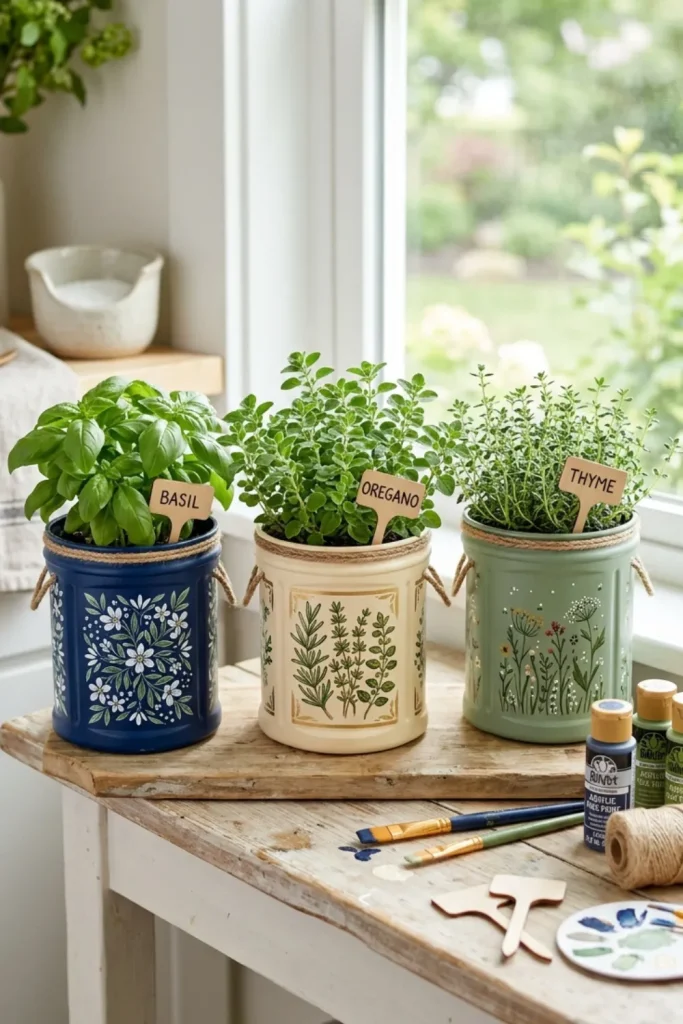 Bring fresh flavor to your cooking with Folgers coffee and herb planters. Poke a few drainage holes in the bottom, fill with potting soil, and plant basil, mint, or thyme on a sunny windowsill. Paint or decorate the cans to match your kitchen, then label each herb. These little planters make it easy to snip fresh herbs while you cook and turn your coffee cans into a mini‑kitchen garden.